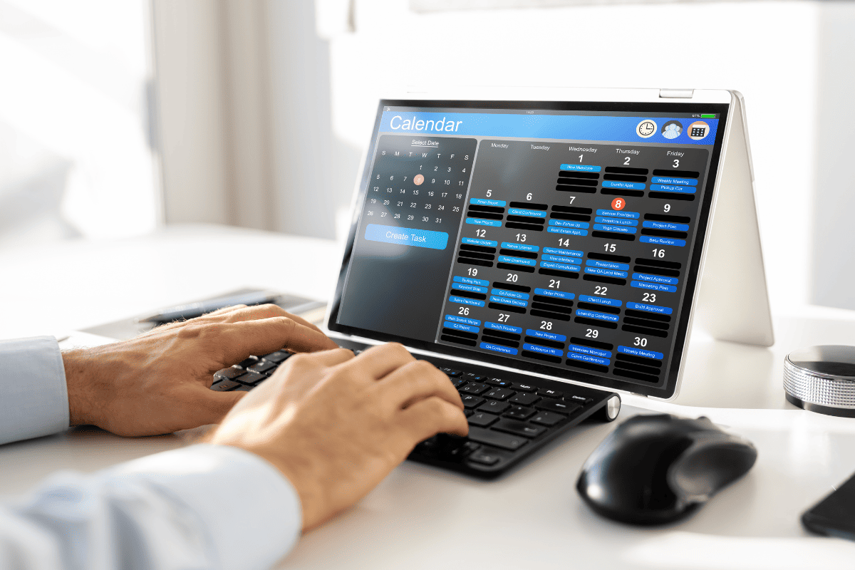Hands holding tablet showing weekly calendar schedule